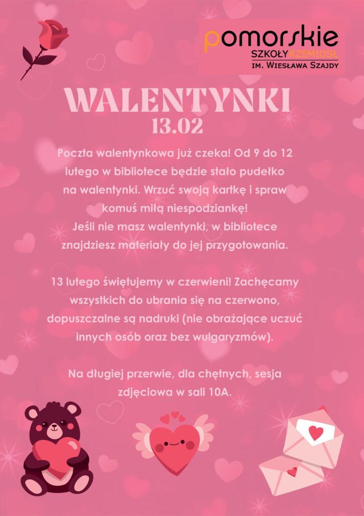 WALENTYNKI 13.02. Poczta walentynkowa już czeka! Od 9 do 12 lutego w bibliotece będzie stało pudełko na walentynki. Wrzuć swoją kartkę i spraw komuś miłą niespodziankę! Jeśli nie masz walentynki, w bibliotece znajdziesz materiały do jej przygotowania. 13 lutego świętujemy w czerwieni! Zachęcamy wszystkich do ubrania się na czerwono, dopuszczalne są nadruki (nie obrażające uczuć innych osób oraz bez wulgaryzmów). Na długiej przerwie, dla chętnych, sesja zdjęciowa w sali 10A