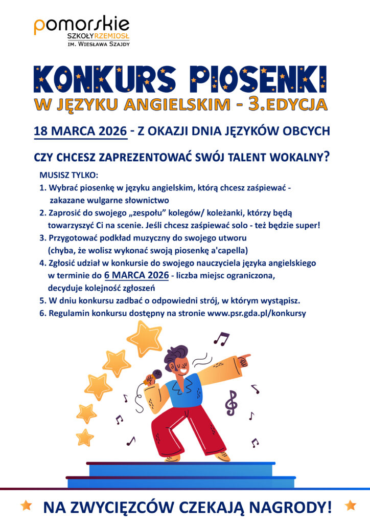 Jeśli chcesz zaprezentować swój talent wokalny – zaśpiewaj nam ulubioną piosenkę w języku angielskim 18 marca 2026 podczas obchodów Dnia Języków Obcych w naszej szkole.