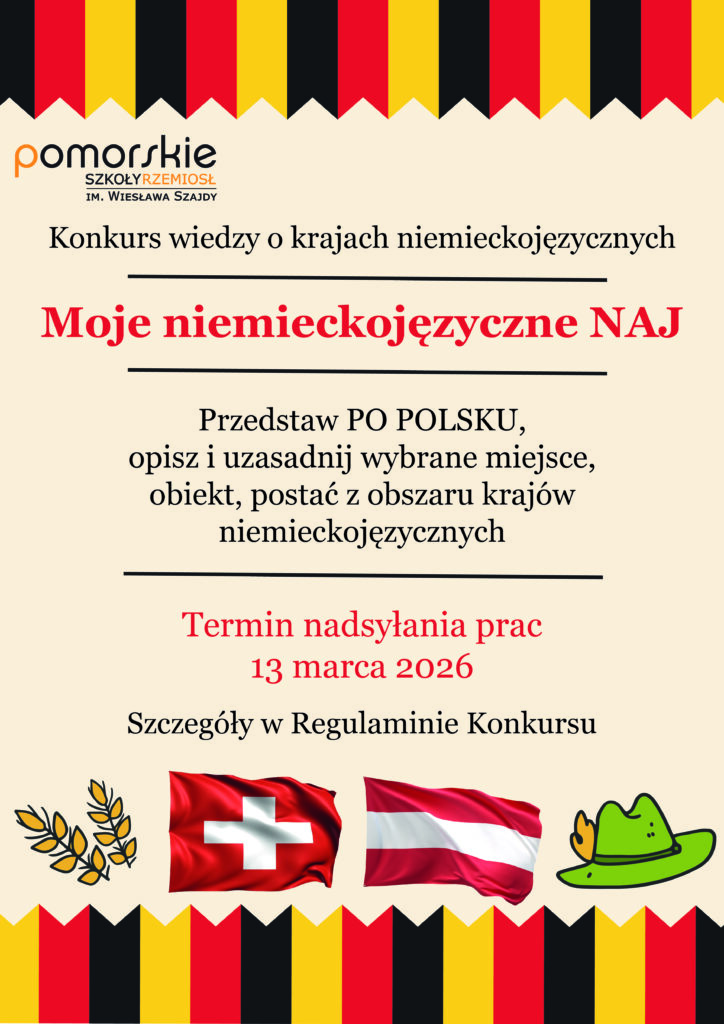 Masz swoje ulubione miejsce, obiekt, pomnik przyrody albo postać z krajów niemieckojęzycznych? Teraz możesz je pokazać innym! Co trzeba zrobić? Wybierz swoje NAJ z krajów niemieckojęzycznych; Prześlij 1–2 zdjęcia; Napisz krótki opis (80–100 słów); Uzasadnij swój wybór (80–100 słów). Całość wyślij do 13 marca 2026 r. na adres mailowy pana Marka Kozłowa. Nie zwlekaj – podziel się swoją inspiracją i pokaż, co zachwyca Cię najbardziej! Zapraszamy do udziału!