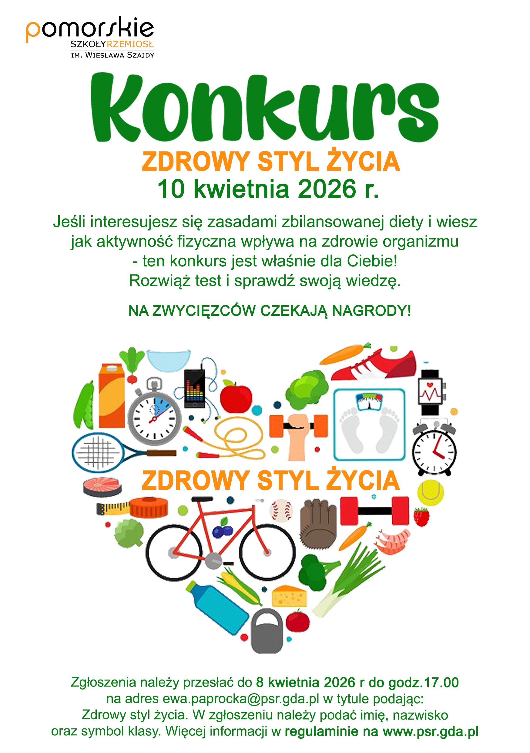 Zapraszamy do udziału w konkursie Zdrowy Styl Życia, który odbędzie się w naszej szkole 10 kwietnia 2026 r. Konkurs polega na rozwiązaniu zadań w formie pisemnej dotyczących: żywienia zgodnego z zasadami zbilansowanej diety, aktywności fizycznej oraz ich wpływu na zdrowie organizmu, edukacji zdrowotnej. Zgłoszenia należy przesłać na szkolnego e-maila do 8 kwietnia 2026r., do godz. 17.00 na adres ewa.paprocka@psr.gda.pl w tytule podając: Zdrowy styl życia. W zgłoszeniu należy podać imię, nazwisko oraz symbol klasy.