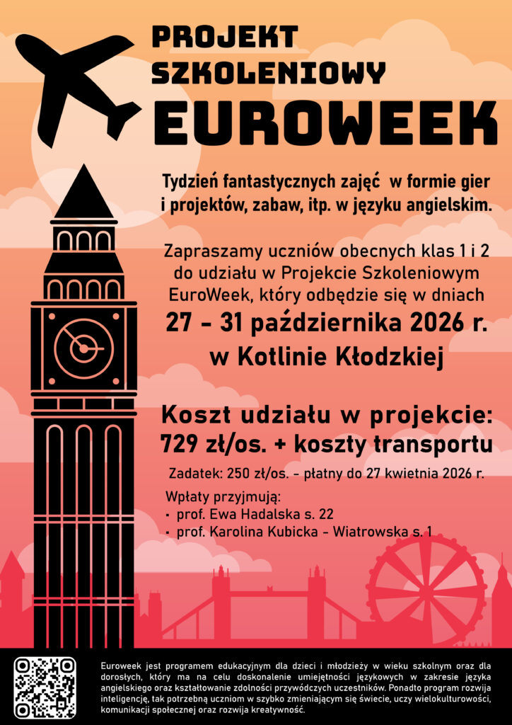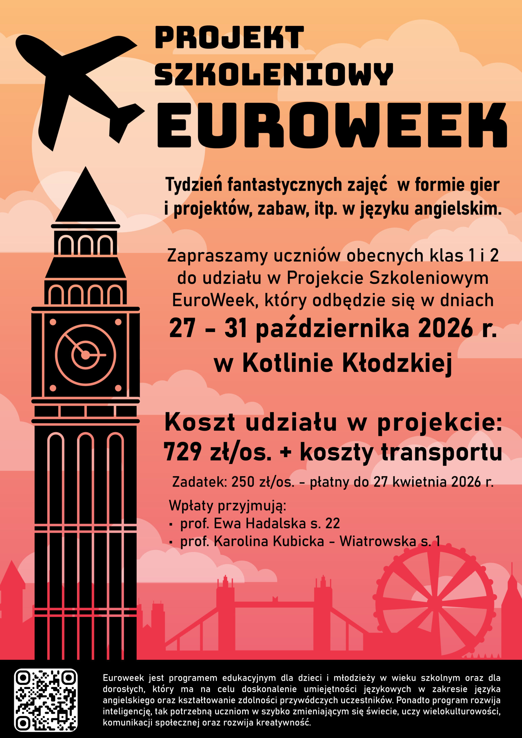 Koszt udziału w projekcie: 729 zł/os. + koszty transportu (najprawdopodobniej pociągiem). Zadatek: 250 zł/os. – płatna do 27 kwietnia 2026 r. Wpłaty: prof. Ewa Hadalska s.22, prof. Karolina Kubicka – Wiatrowska s.1. Euroweek jest programem edukacyjnym dla dzieci i młodzieży w wieku szkolnym oraz dla dorosłych, który ma na celu doskonalenie umiejętności językowych w zakresie języka angielskiego oraz kształtowanie zdolności przywódczych uczestników. Ponadto program rozwija inteligencję, tak potrzebną uczniom w szybko zmieniającym się świecie, uczy wielokulturowości, komunikacji społecznej oraz rozwija kreatywność.