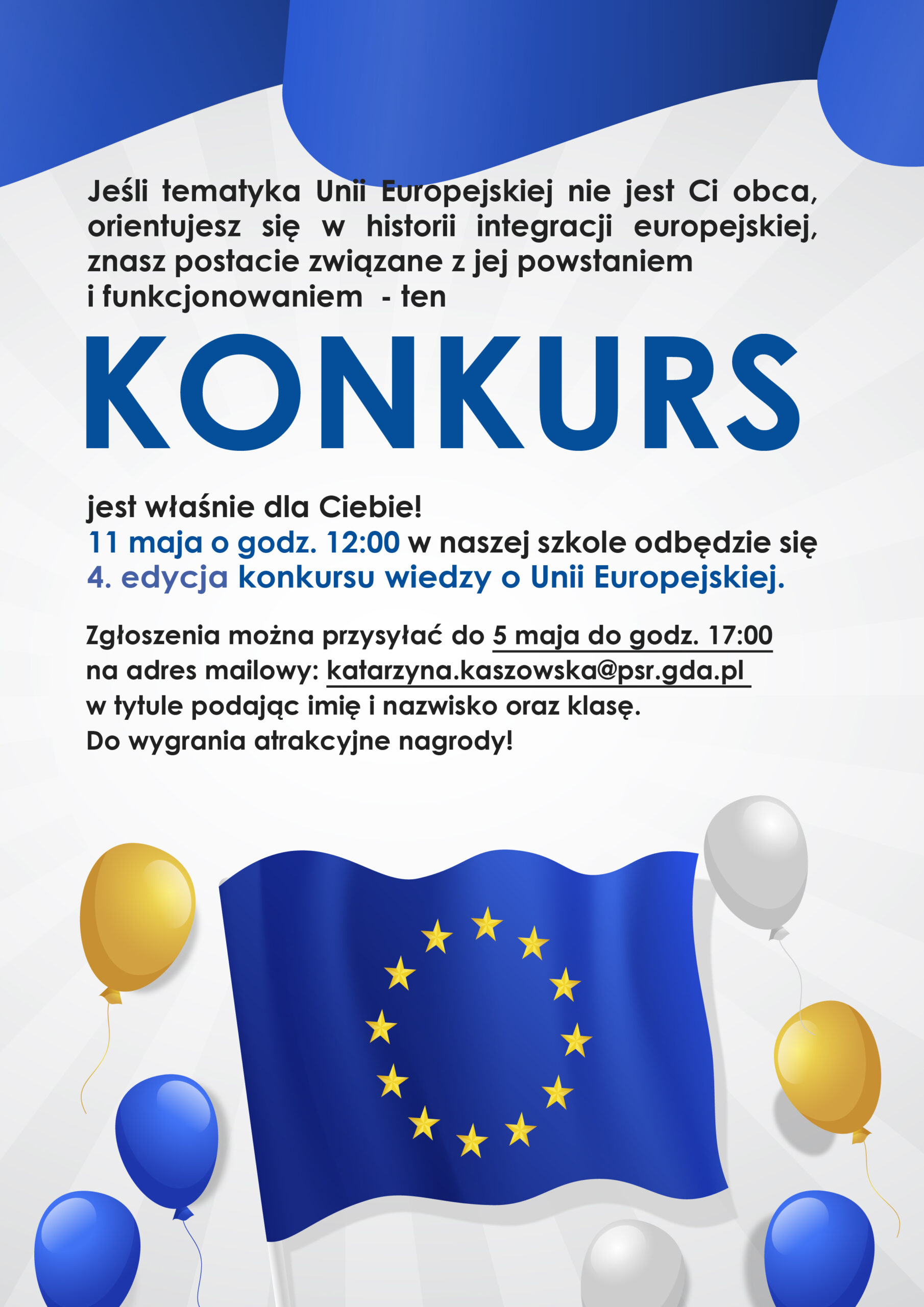 Wszystkich zainteresowanych tematem historii integracji europejskiej oraz Unią Europejską zapraszamy do udziału w IV. edycji konkursu wiedzy o Unii Europejskiej, który odbędzie się 11 maja o godz. 12:00 w naszej szkole. Zgłoszenia wysyłajcie na adres mailowy katarzyna.kaszowska@psr.gda.pl podając imię, nazwisko i klasę. Do wygrania atrakcyjne nagrody!